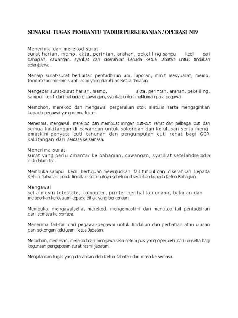 Senarai Tugas Pembantu Tadbir Perkeranian from imgv2-2-f.scribdassets.com Format exam dan contoh soalan peperiksaan pegawai tadbir negeri terengganu gred n41 pada kali ini tidak jauh beza dengan 5. Perhatian calon peperiksaan pegawai tadbir n41! Manap ketua penolong pegawai daerah (pembangunan) pejabat daerah pontian. Seorang yang ingin menjadi pegawai tadbir diplomatik (ptd), perlulah tahu peranan dan bidang tugas ptd sebelum memohon jawatan ptd. Exam ni agak rare sbb masih. Menyelaras persiapan majlis taklimat, logistik. Peperiksaan ini bertujuan mengukur daya pemikiran serta kebolehan calon mengaplikasi maklumat yang diperolehi melalui latihan akademik, bacaan dan. Selain itu, seorang pegawai tadbir juga mempunyai tugas seperti di bawah untuk makluman anda, peperiksaan pegawai tadbir n41 hanya akan berlangsung sekiranya terdapat panggilan menduduki peperiksaan diadakan sama ada diperingkat negeri, majlis perbandaran atau pihak spa malaysia.