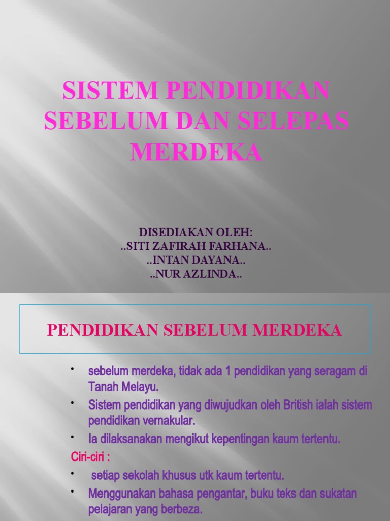 Sistem ini telah dikawal sepenuhnya oleh pihak penjajah inggeris. Syed anwar bin syed ibrahim 2.nur rubiyatul fariani binti zuhari 3.nurul nadhirah binti hd nawawi 4.nor hanifa binti juha 5.fatin nabila binti mizan. Pada 31 ogos 1957, tepat jam dua belas tengah malam, malaya atau persekutuan tanah melayu diisytiharkan sebagai negara yang merdeka. Kemajuan teknologi informasi dan komunikasi yang semakin pesat ternyata. Sistem pendidikan menjadi lebih merakyat.